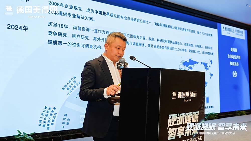 活动现场,尚普咨询集团创始合伙人兼CEO邓新宇为德国美得丽颁发“硬派护脊睡眠领导品牌”认证证书。*数据来源:尚普咨询集团,覆盖全渠道市场,通过专家及企业调研,对比全国(不包括港澳台)范围内各品牌经营情况,得出:美得丽,硬派护脊睡眠领导品牌;硬派护脊睡眠特指采用脊椎测量尺技术,硬度适中或偏硬的床垫;领导品牌指在市场端、技术端、产品端和影响力四个维度均处于行业领先地位的品牌。 统计时间:2024年1月1日至2025年8月31日;本声明于2025年10月完成调研。