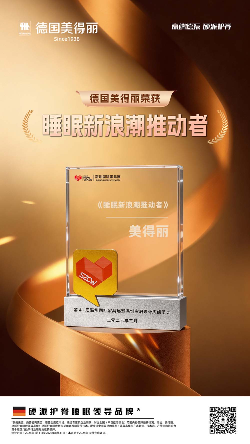 硬派德系,赢领未来!德国美得丽凭借品牌和产品的发展势能的卓越表现,荣获《睡眠新浪潮推动者》奖项。这一殊荣不仅是对德国美得丽近百年匠心积淀的实力印证,更是行业对其以德系工艺、自然材质与科学护脊理念引领睡眠消费升级的高度认可。
