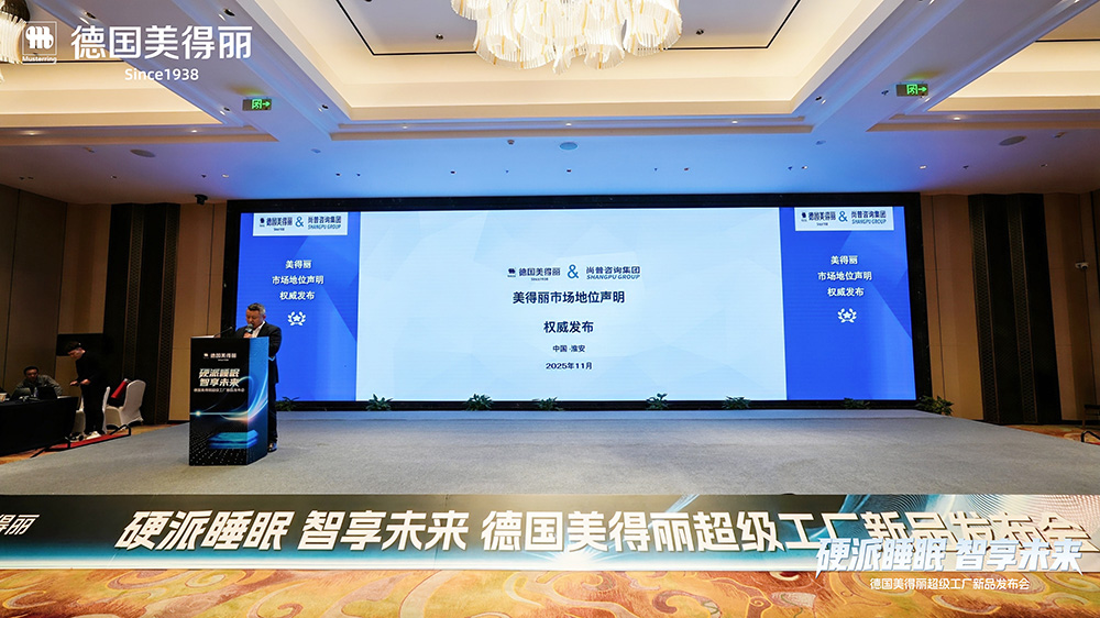活动现场,尚普咨询集团创始合伙人兼CEO邓新宇为德国美得丽颁发“硬派护脊睡眠领导品牌”认证证书。*数据来源:尚普咨询集团,覆盖全渠道市场,通过专家及企业调研,对比全国(不包括港澳台)范围内各品牌经营情况,得出:美得丽,硬派护脊睡眠领导品牌;硬派护脊睡眠特指采用脊椎测量尺技术,硬度适中或偏硬的床垫;领导品牌指在市场端、技术端、产品端和影响力四个维度均处于行业领先地位的品牌。 统计时间:2024年1月1日至2025年8月31日;本声明于2025年10月完成调研。