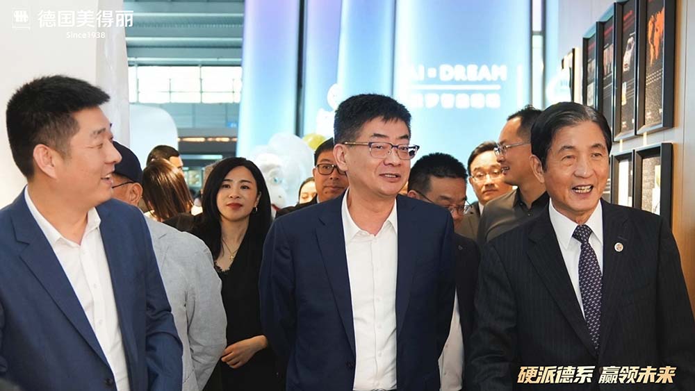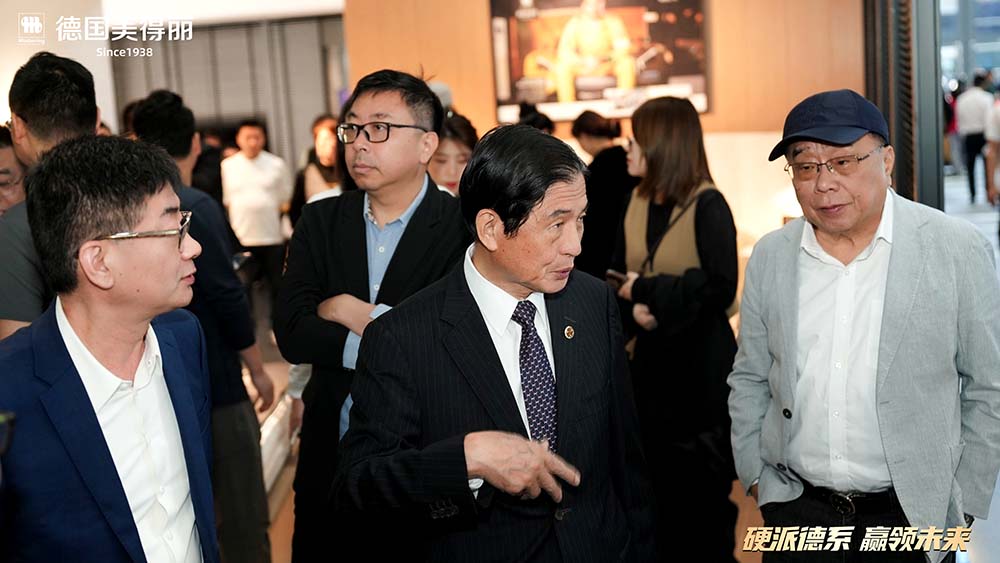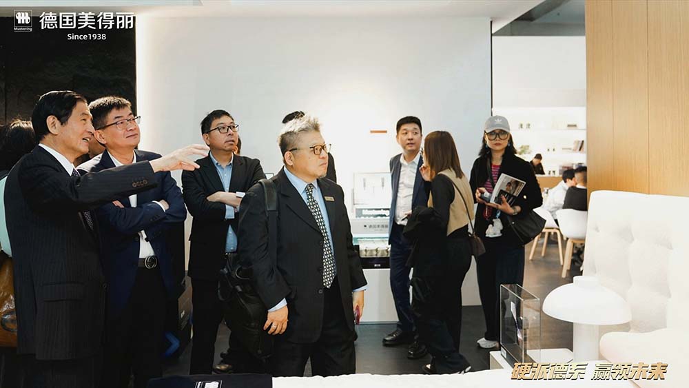 运时通控股集团董事长陈燕木博士、运时通控股集团总裁陈冠宇、运时通控股集团总裁陈冠翰【视频号ID:床二代翰哥】、德国美得丽中国区总经理邓亮、德国美得丽事业部副总经理王瑞东等公司高管陪同居然之家董事长兼CEO王宁,中国国际商会家居建材产业委员会主席、全国台企联荣誉会长、台升国际集团董事长郭山辉、中国国际商会家居建材产业委员会秘书长文锋等多位重磅领导、嘉宾参观德国美得丽展馆。